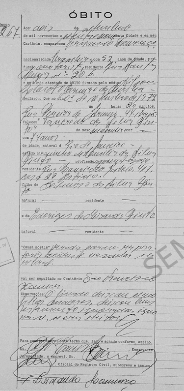 Antes de abordarmos o tema da morte, é importante destacar um momento significativo da vida, que nos conecta com a continuidade da existência humana: o nascimento. O nascimento de Tata Tancredo da Silva Pinto, uma figura central para a nossa história, marca o início de uma jornada única e memorável. Conforme registrado no livro de registros do Cartório de Cantagalo, no estado do Rio de Janeiro, sua certidão de número 502, página 195, certifica o seu nascimento em 10 de agosto de 1905.